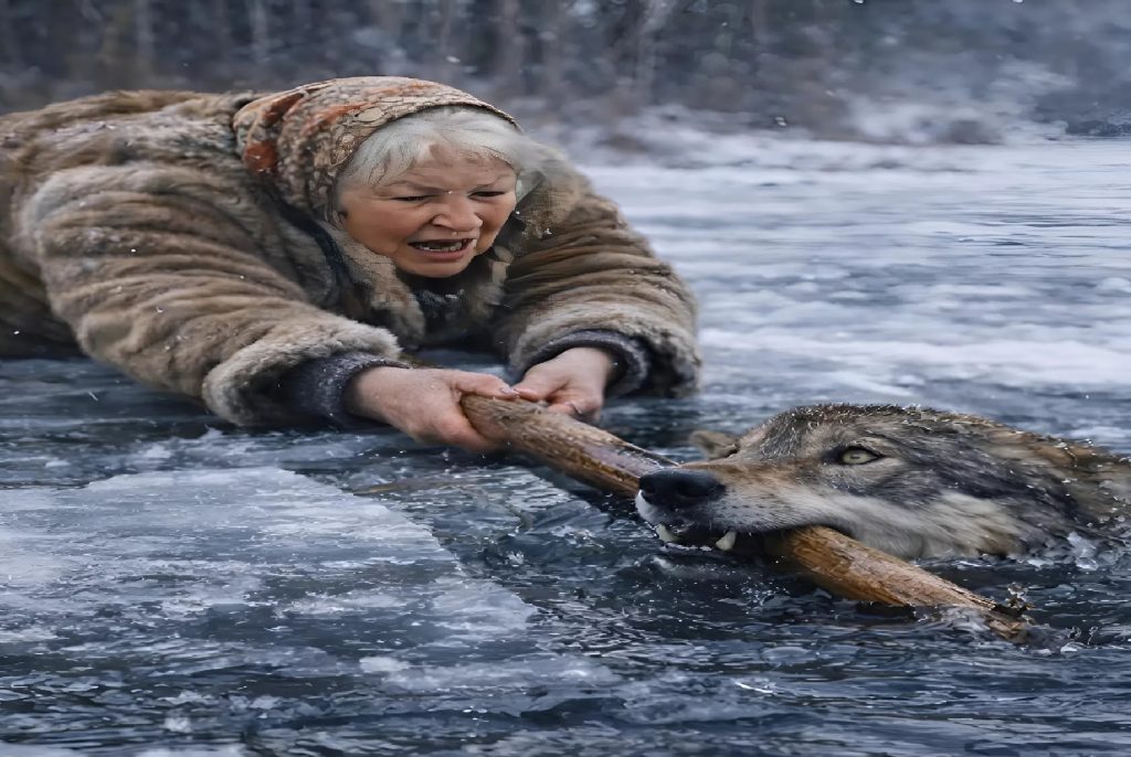 Nem messze onnan egy idős asszony rőzsét gyűjtött. A téli erdő csendjét hirtelen vízcsobbanás és rekedt, fulladozó hang törte meg. Közelebb lépett, és amit meglátott, szinte földbe gyökerezte a lábát: egy hatalmas szürke farkas vergődött a lékben.